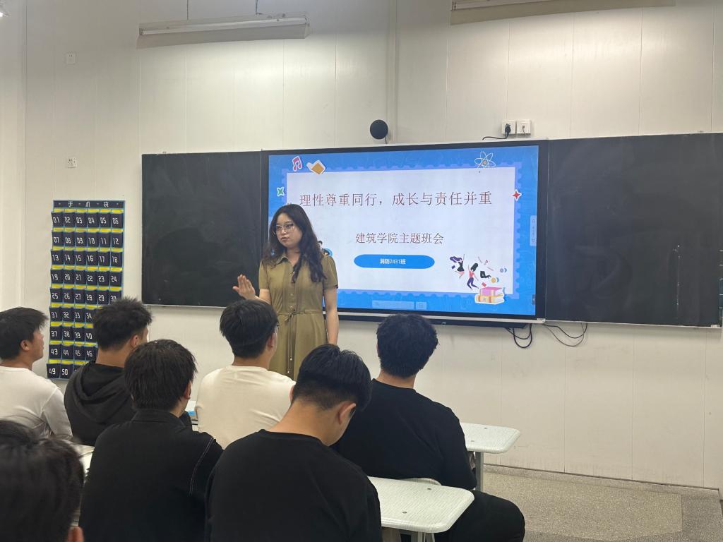为引导青年学生树立积极健康的恋爱价值观,明确恋爱与学业、个人成长的关系,建筑学院于6月4日-6日开展了以“理性与尊重同行,成长与责任并重”为主题的专题班会。班会聚焦新时代青年精神风貌塑造,深入探讨了如何在情感交往中坚守理性、秉持尊重、共担责任、追求共同成长。