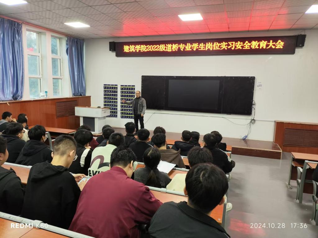 2024年10月28日,建筑学院针对2022级道路与桥梁工程技术专业学生召开了“岗位实习动员会暨安全教育大会”。闫积刚、薛宝恒、何文荣、仇大未、王丹及实习指导教师和班主任参加了大会。