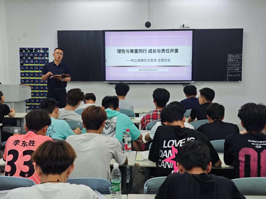 为引导青年学生树立积极健康的恋爱价值观,明确恋爱与学业、个人成长的关系,建筑学院于6月4日-6日开展了以“理性与尊重同行,成长与责任并重”为主题的专题班会。班会聚焦新时代青年精神风貌塑造,深入探讨了如何在情感交往中坚守理性、秉持尊重、共担责任、追求共同成长。