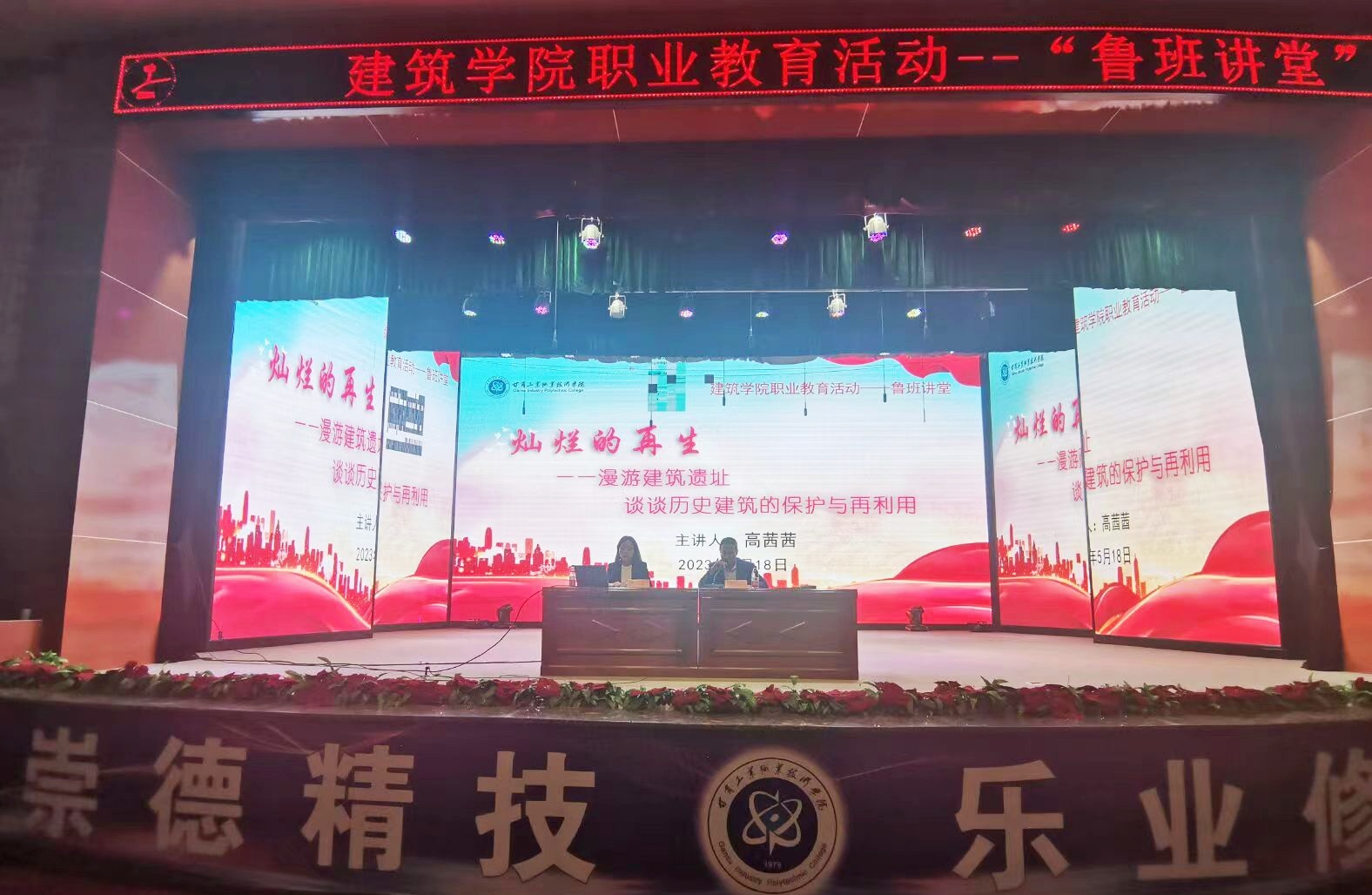 为拓宽学生的视野,增涨学生的专业见识,提升学生的专业素养,呼吁师生重视对历史建筑的发展历史、类型及特点的了解与保护, 5月18日晚,建筑学院在大学生活动中心开展职业教育周系列活动——鲁班讲堂,建筑学院高茜茜老师作了题为“灿烂的再生——漫游建筑遗址,谈历史建筑的保护与再利用”专题讲座,会议由建筑学院党支部副书记薛宝恒主持,学院师生共400余人参加了此次讲座。