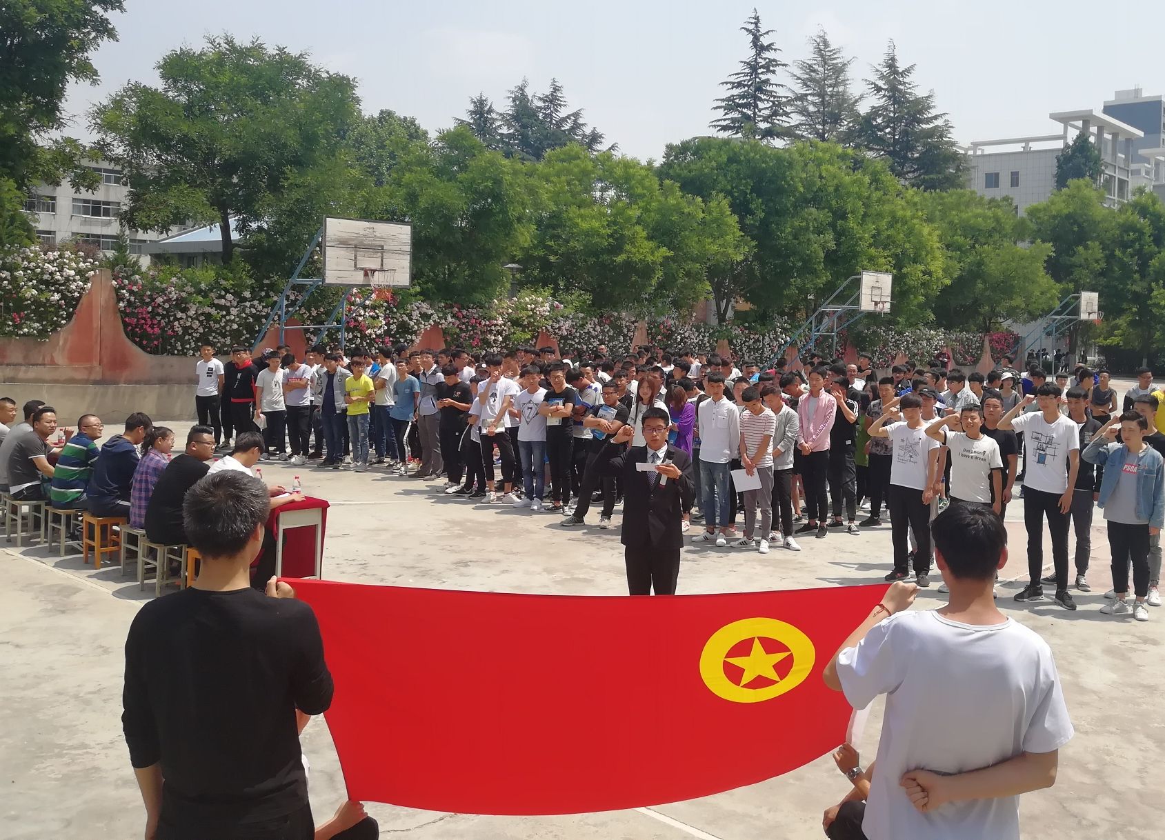 2018年5月15日,我院在大学生活动中心对面操场举行隆重的新团员入团仪式。出席本次活动的老师有我院党总支副书记潘栋、学生辅导员裴旻峰、王京、宋彦达、邓薇薇。全体17级学生参加。